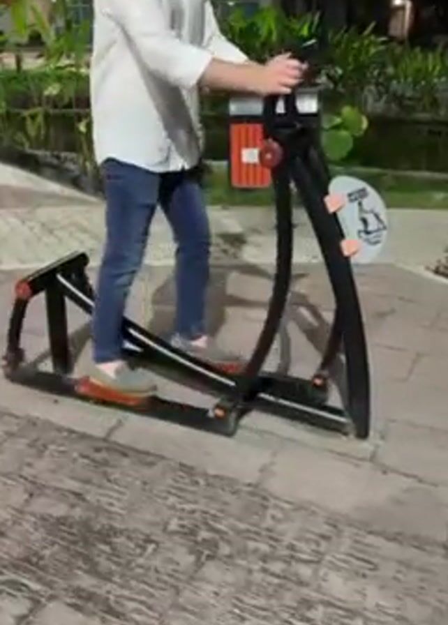 man using an outdoor exercise machine and then pans to the surrounding environment at night