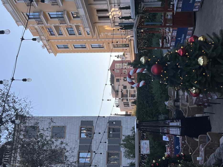 This image depicts a festive outdoor market and seating area within Porto Montenegro, Tivat, Montenegro. The scene is illuminated by natural daylight under a clear blue sky. In the foreground and mid-ground, multiple outdoor dining tables are arranged, draped with red and white patterned tablecloths, accompanied by woven chairs. A tall, black outdoor patio heater is positioned near a market stall on the left. This stall features a red and white themed display and signage indicating "Chef Street Food" and "Vino & Delicije." To the right, two dark-blue market stalls, marked "Festive Market," showcase various items, likely food or craft products. Several artificial Christmas trees, adorned with red and gold baubles and small warm lights, are strategically placed throughout the area. A prominent large red and white striped candy cane decoration stands vertically near a central Christmas tree. String lights, featuring exposed Edison bulbs, are strung overhead across the entire scene. A single individual is observed seated at a table in the mid-ground, their back to the viewer, facing towards the right side of the frame. The ground appears to be a light-colored paved or gravel surface, bordered by a green hedge separating the seating area from background elements. The background features several buildings. On the left, a multi-story building constructed with light-colored, possibly grey, stone or brick, displays rectangular windows fitted with closed grey shutters. On the right, a taller, multi-story building with a yellow/ochre facade features multiple balconies and dark-paned windows. Further in the background, a distinct reddish-pink building and other lighter-toned structures are visible, with additional string lights strung between them.