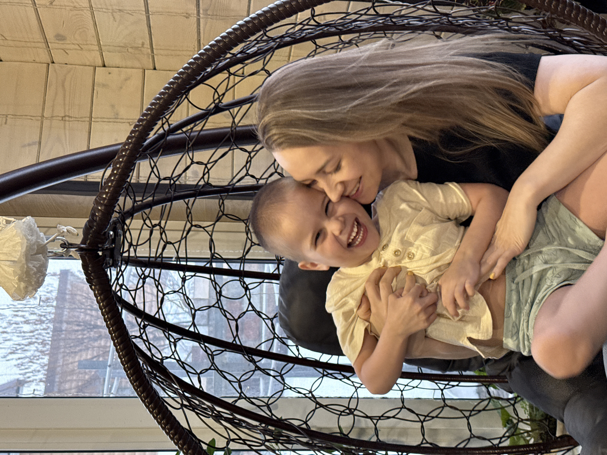 - "A woman with long blonde hair, wearing a black shirt, is holding a young child with short brown hair in a hanging chair made of dark brown woven material" by FM-Y3efA2, licensed under CC BY 4.0