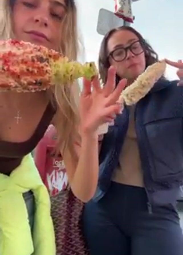 Two young women are eating corn on the cob that is impaled on sticks. The woman on the left has long brown hair and is wearing a brown top and a neon green jacket. The corn she is eating has a red-dusted top. The woman on the right wears glasses, a tan top, and a dark blue puffy jacket. Her corn is unadorned. They take bites of the corn and make faces at the camera. They stand under a white tented structure with some sort of red metal box behind them.