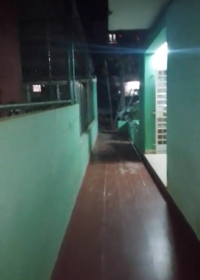narrow, outdoor corridor at night. The corridor has a tiled floor of dark reddish-brown hue. The walls on either side are painted in a light blue-green color, with some signs of weathering and possible mold. A wire fence runs along the upper left side. The lighting is dim, primarily provided by a light source at the end of the corridor and possibly from within a building on the right, casting shadows along the walls. The corridor seems to lead to an open area where vegetation is visible. The camera appears to be moving forward, capturing the perspective of someone walking down the corridor.