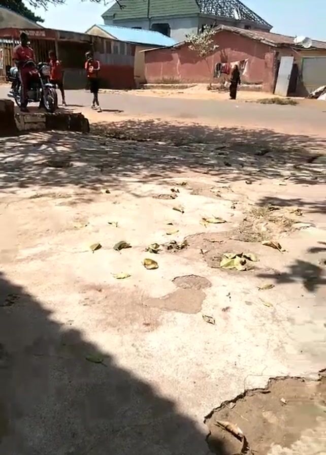 view from the shade of a tree looking at a dusty street in a sunny, likely tropical, location. Two children in school uniforms walk away from the viewer down the street. A man sits on a motorcycle on the side of the street. Another woman in a black dress walks in the opposite direction of the children. The street is made of cracked concrete and littered with fallen leaves. There are small buildings on both sides of the street, some under construction. A person dressed in purple walks down the street past the children.