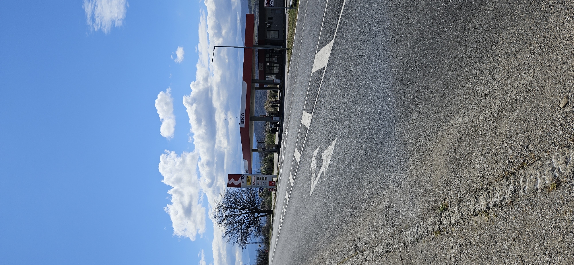 A slightly rotated shot of an EKO gas station along a road in Usoika, Bulgaria. The gas station has a red roof and an adjacent building. The road has directional arrows painted on the surface. A bare tree stands near the gas station's price sign. The sky is blue with scattered cumulus clouds. The foreground is dominated by the asphalt road surface.