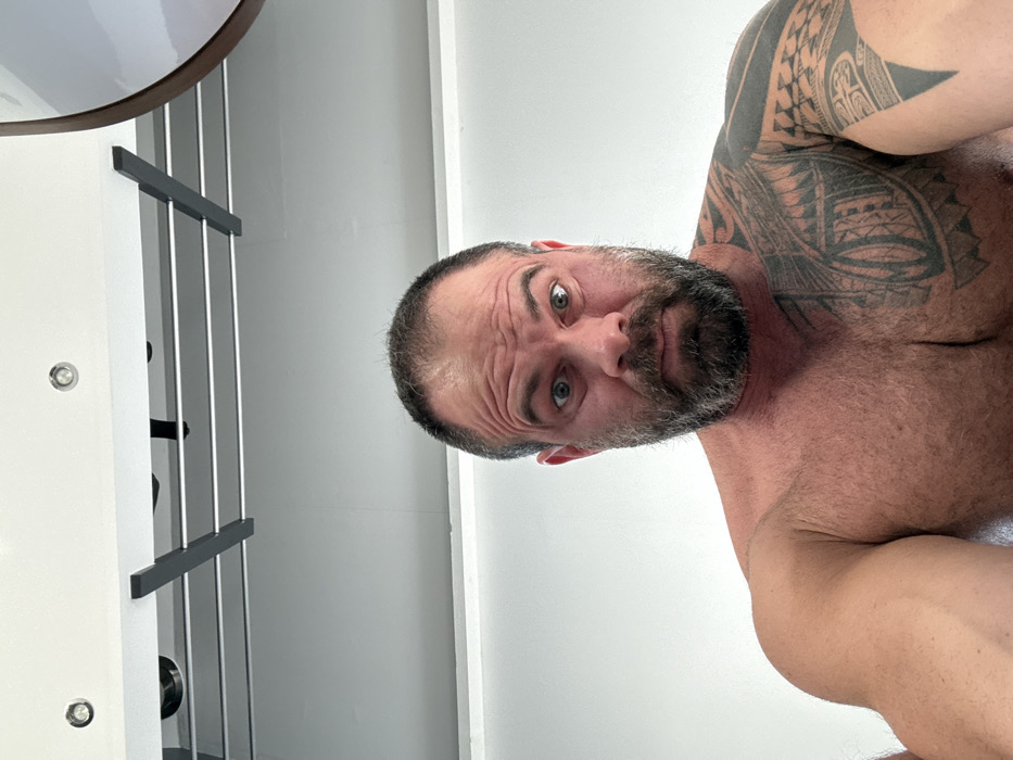 An adult male is depicted in a close-up, eye-level selfie, positioned in what appears to be a modern indoor environment within the city of Marche-en-Famenne, Belgium. The man, likely in his 30s or 40s, possesses a dark, full beard and short, dark hair with a visible receding hairline. His eyes are wide and directly focused on the camera, conveying an expression of intensity or surprise, characterized by slightly raised eyebrows and a furrowed brow. He has a muscular physique and is shirtless, revealing a prominent, intricate black tattoo covering his left shoulder, extending onto his upper arm and left pectoral area. The tattoo design features bold, geometric, and curvilinear patterns. The background consists of a plain white wall directly behind the subject. Above the man's head, a white ceiling is visible, equipped with two circular recessed spotlights. Below the ceiling, a horizontal light-colored panel or fixture with multiple horizontal silver-colored bars is present. A dark, rectangular element, possibly a support bracket, extends downwards from this structure. A partial view of a curved object with a brown frame, likely a mirror, is visible in the upper right quadrant of the image. The lighting appears to be bright and artificial. No other individuals or significant objects are present.