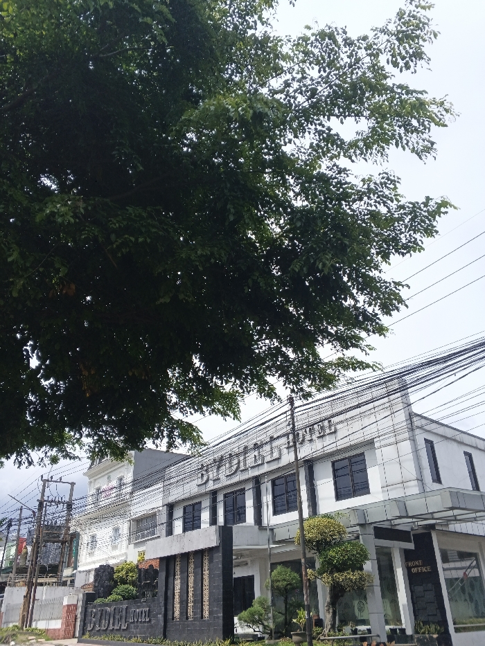 A white building, "BYDIDEL HOTEL," with black-framed windows stands behind a black fence and garden. Lush green foliage from a tree obscures the top of the building and the cloudy sky. Utility poles line the street, with a second, white hotel visible in the background to the left. The ground is a mix of pavement and some vegetation. The front office of the hotel is located on the right side of the image.