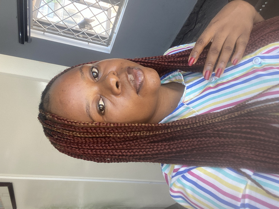 The image features an adult female subject of African descent, positioned in a medium close-up indoors in Gwarinpa, Nigeria. She faces forward with a slight tilt to her right. The subject has reddish-brown box braids, some with lighter strands, extending down her shoulders. She wears a collared button-up shirt with vertical stripes in light blue, pink, yellow, and white. Her left hand, adorned with red nail polish, rests on her upper chest. The background consists of a light-colored wall or partition to the left, with a partially visible dark-framed object at the top. To the right, a dark grey wall section is visible adjacent to a window. The window has white framing, partially lowered black roller blinds, and a diamond-patterned security grille. Through the window, blurry green foliage and external structures are discernible. The scene is illuminated by natural light entering from the window.