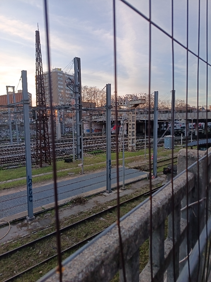 - "The image presents an extensive railway yard in Toulouse, France, observed from an elevated perspective through a blurred wire mesh fence and a concrete barrier in the immediate foreground" by FM-Fezcd2, licensed under CC BY 4.0