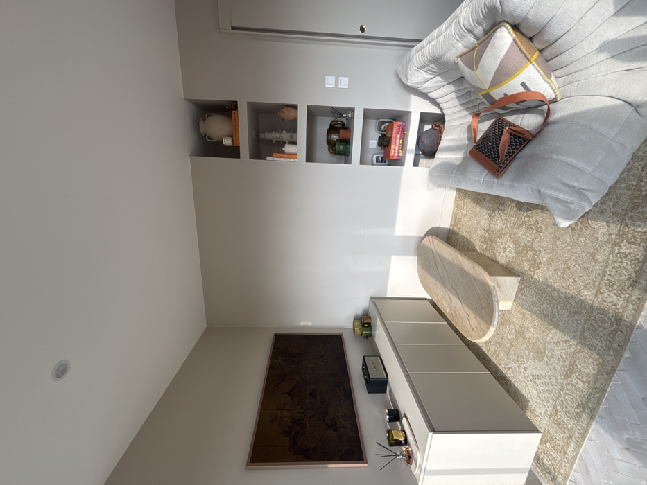 This image depicts a sunlit interior room, identified as a residential space in Courbevoie, France. The room features light greige walls and a white ceiling with a single recessed light fixture visible. On the left, a long, low, light beige cabinet with four handleless doors stands against the wall. Above it, a large horizontal artwork with an antique, perhaps Asian-inspired, landscape scene in muted brown tones and a thin light brown frame is mounted. On the cabinet's surface, from left to right, are a white rectangular tray containing an aroma diffuser with dark glass bottles and reeds, two dark candles, a small decorative dish, a black Marshall brand portable speaker with gold accents, and two small green ceramic pots. A light-colored veined stone (possibly travertine) oval coffee table with a solid pedestal base occupies the center of the room. To the right, a light grey fabric sofa with a distinct pleated or segmented design is positioned. Resting on the sofa are a brown and black patterned handbag with an orange strap, and a rectangular throw pillow featuring a geometric design in muted yellow, grey, and brown tones. The right wall incorporates a vertical set of four recessed shelves, or niches. From top to bottom: * The top niche holds a large light-colored ceramic urn, a book with an orange spine, and a small candle. * The second niche contains a white sculptural object, another book with an orange spine, and a small terracotta-colored pot. * The third niche displays a dark green ceramic teapot or jug, a dark green ceramic mug, a small silver dish, and a small candle. * The bottom niche holds a stack of books, one prominent with a red and orange cover ("CAPTAIN MORGAN", "MARRAKESH FLAG"), two small framed pictures, and a small decorative item. Below this, a dark fabric item is placed on the lowest part of the niche opening. Natural sunlight enters from an unseen window on the right, casting distinct shadows on the light beige patterned rug that covers most of the floor. A portion of light-colored herringbone tile flooring is visible in the lower left foreground. A light-colored door with a round brass-toned handle is partially visible on the far right side of the image. No individuals are present.
