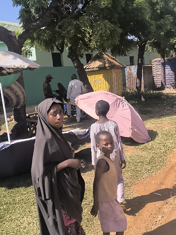 This image captures an outdoor scene in Muchiya, Nigeria. In the immediate foreground, a young female wearing a dark grey hijab over a patterned garment looks directly at the camera. To her right, a younger child, possibly male, in a light tan sleeveless top and pink shorts, also looks towards the camera. Behind this child, a third child in a vertical striped long-sleeved garment stands with their back largely to the viewer, positioned near a collapsed pink umbrella lying on the ground. In the midground, two adult males are visible. One, wearing a dark shirt and a red cap, stands next to a black motorcycle. The other adult male, dressed in a white patterned long-sleeved outfit, has his back to the camera. Partially visible on the far left, a white and brown striped market umbrella is open. The ground is a mix of green grass and reddish-brown dirt paths. Several large trees with dense green foliage are prominent, casting shadows. In the background, a light green building with dark rectangular openings is visible. To the right of the trees, two small, possibly makeshift structures stand: one is yellow corrugated metal with a peaked roof, and the other appears to be constructed from various corrugated metal and wooden panels. The scene is illuminated by bright daylight, suggesting a sunny environment.
