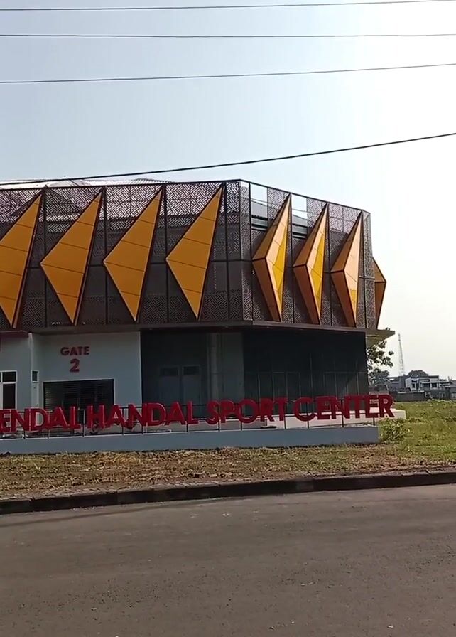 exterior of the Kendal Handal Sport Center on a bright, sunny day. The building has a modern design with a dark metal framework and large yellow, triangular panels. The words "Kendal Handal Sport Center" are displayed in large red letters in front of the building, along with "Gate 2". A road runs in front of the sport center, and there is an open field to the side. There are no people visible in the scene.