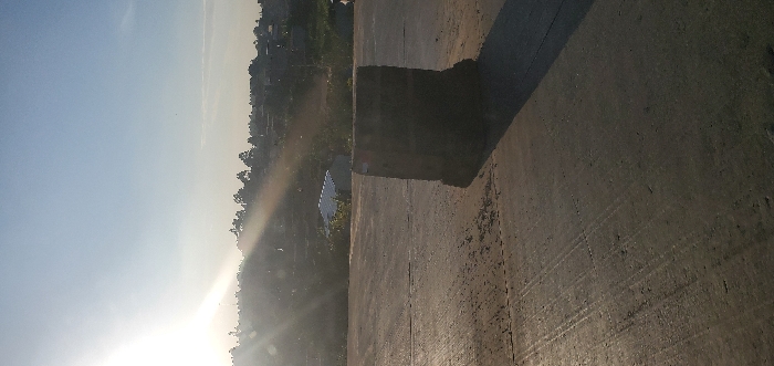 The image portrays an outdoor scene within Kikuyu Township ward, Kenya, bathed in bright, low-angle sunlight originating from the upper left, causing a distinct lens flare. The foreground consists of a dark, textured paved surface, likely asphalt or concrete, exhibiting multiple parallel tire marks and minor debris. A weathered, dark grey, rectangular concrete barrier block stands upright slightly right of the frame's center, casting a pronounced shadow to its right. Beyond the paved surface, a vegetated slope descends, revealing a small building with a light-colored, sloped roof. The distant background features rolling terrain covered with trees and scattered residential structures beneath a clear, light blue sky. No individuals, actions, or interactions are present.