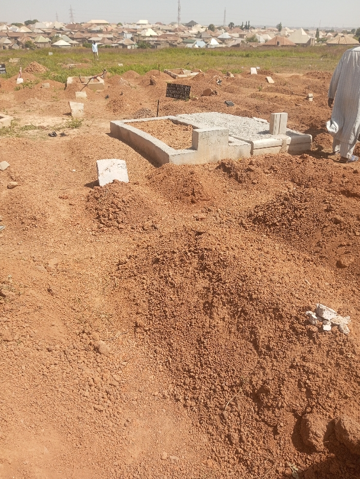 The scene depicts a cemetery in Rigasa, Nigeria, under a clear, bright sky