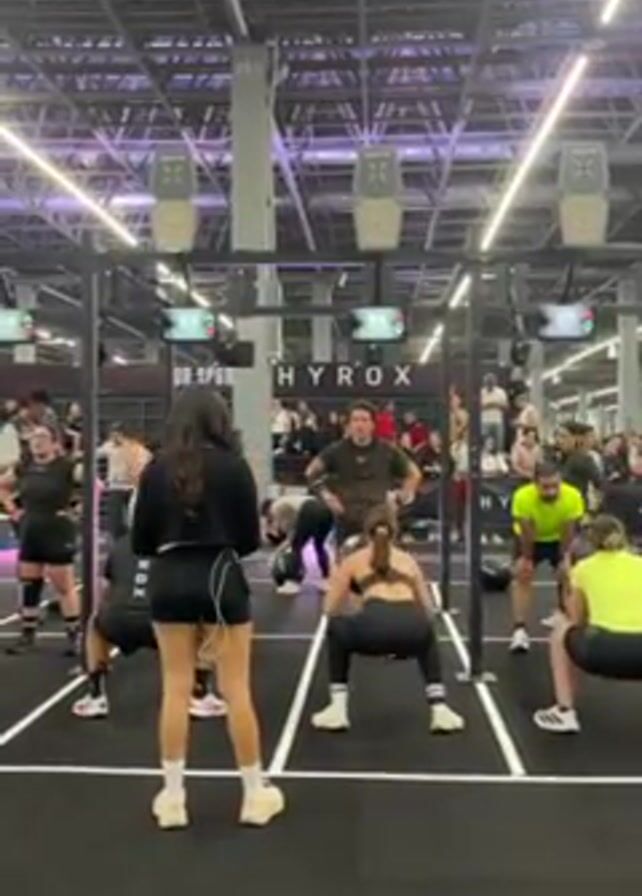 group of people at a HYROX fitness event, performing a workout with medicine balls. They squat down and raise the ball overhead in unison. The participants are dressed in athletic wear. The event takes place in a large indoor space with overhead lighting and a black floor marked with white lines. Spectators can be seen in the background.