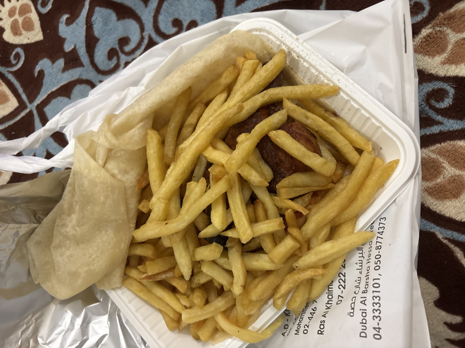 A white ribbed plastic container holds a takeaway meal, primarily consisting of golden-brown french fries. Beneath the fries, a darker, reddish-brown grilled meat, possibly cylindrical, is partially visible. A segment of light-colored flatbread is draped over a portion of the fries and meat. The container is placed inside a translucent white plastic bag, which rests on a patterned rug featuring shades of blue, brown, and cream. Visible text on the plastic bag includes contact information: "A.D." and a phone number beginning with "02-446 7...", indicating an establishment associated with Abu Dhabi, United Arab Emirates. Further text lists "Ras Al Khaima" with an "07" prefix, and "Dubai Al Barsha Hessa Street" with "04" and "050" phone number prefixes. No people or active interactions are depicted.