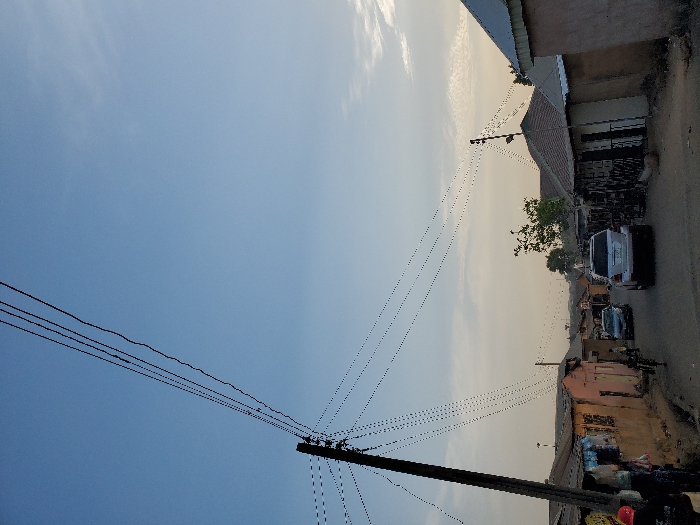 A low-angle shot reveals a residential street under a partly cloudy blue sky. Power lines stretch across the scene. Buildings line the street, with some featuring red-tiled roofs. A couple of cars are parked along the side of the road. The image is rotated to the right, making it seem like the street is going upwards.