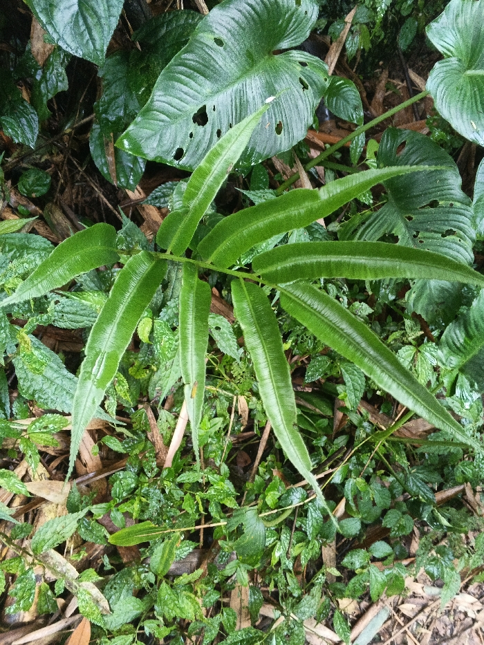 The scene depicts a dense undergrowth on a forest floor in Baglung, Nepal. A central, bright green plant, consistent with a fern species, displays multiple elongated, finely ribbed fronds radiating outwards. Surrounding this plant are larger, darker green, ovate leaves, some exhibiting irregular perforations indicative of insect damage. The ground is covered with a variety of smaller, compact green foliage, and interspersed throughout are scattered pieces of brown, decaying plant matter, including what appears to be bamboo leaf fragments. All visible vegetation surfaces appear wet or glossy, suggesting recent rainfall or high humidity. No human subjects or man-made objects are present. A small, pale, possibly insect or water droplet, is visible on one of the larger damaged leaves in the upper-right quadrant, and a minute yellowish-green object is present on one of the central fern fronds.