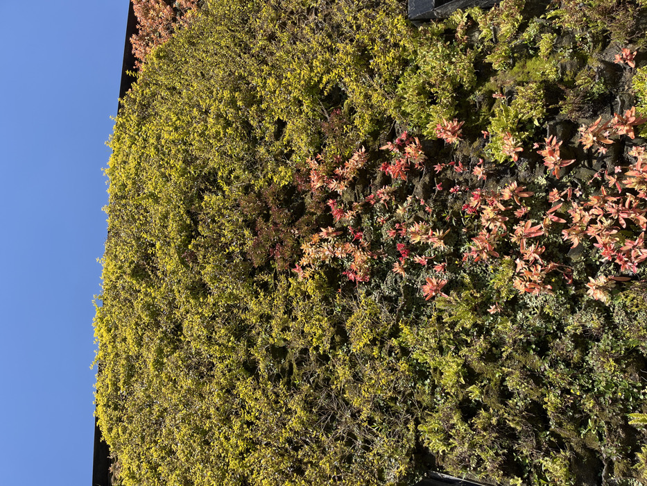 A vibrant vertical garden thrives, showcasing a diverse array of plant life