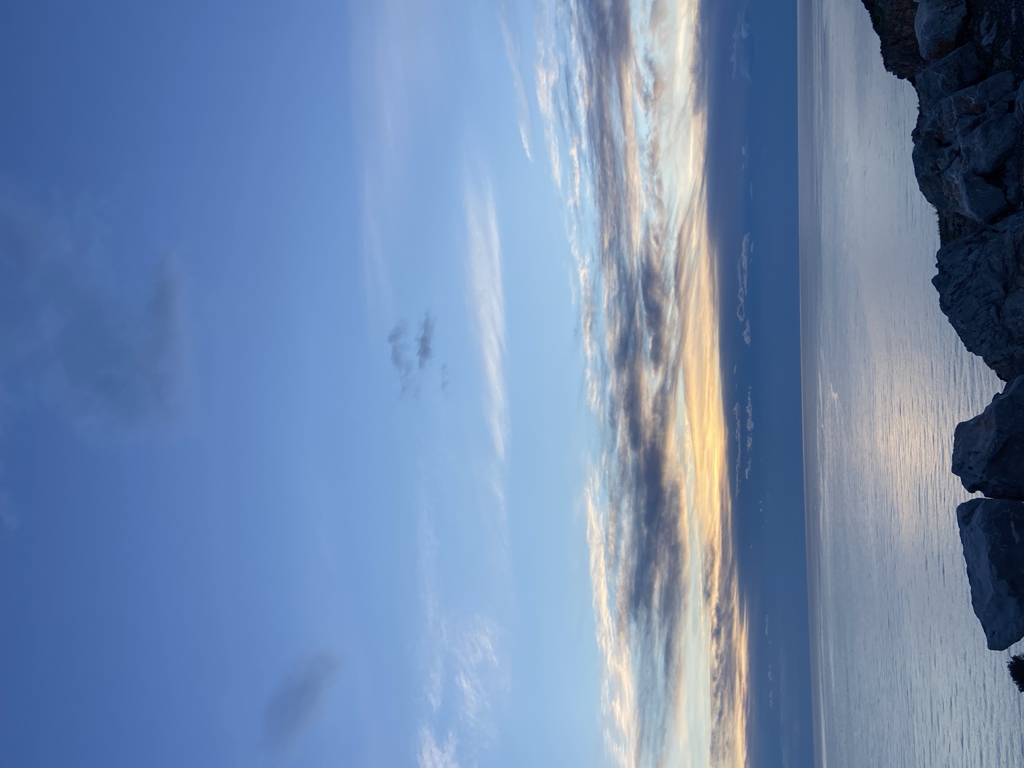coastline view from what appears to be a rocky cliff. The sky is blue with wisps of clouds, transitioning to darker, striated clouds near the center. The sea is calm and reflects the sky. The edge of the cliff is visible on the right side of the image. There is no information about this photo being taken at Kovačko Polje.