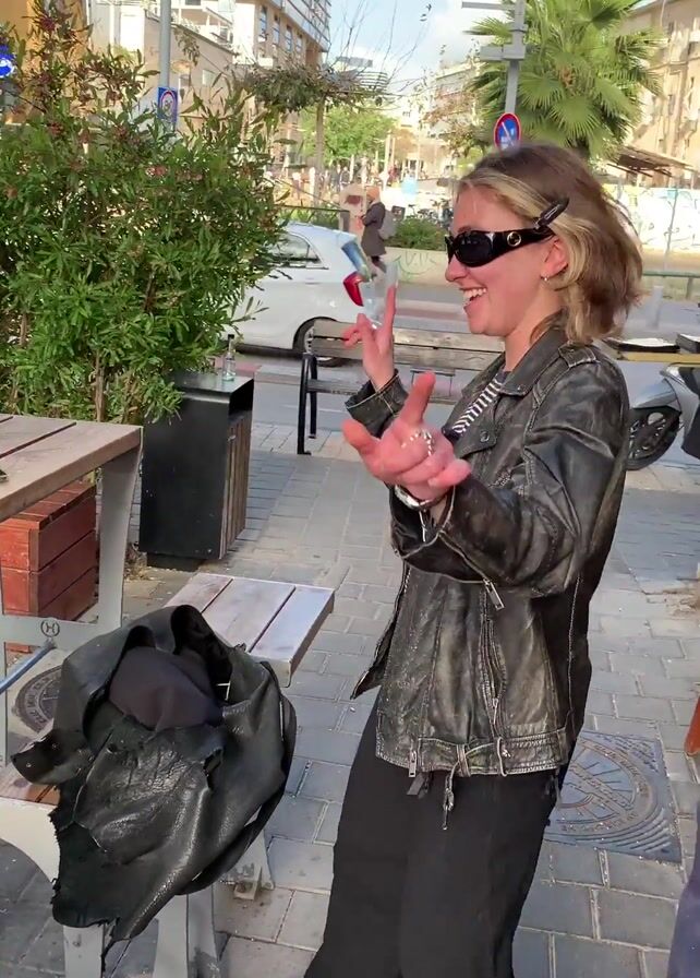 A young woman with blonde hair is dancing outdoors on a city street. She is wearing sunglasses, a striped shirt, a black leather jacket, and black pants. She has a black bag hanging on a nearby table. The area is a sidewalk with buildings, trees, and a cafe or bar visible in the background. She is smiling and appears to be enjoying the music.