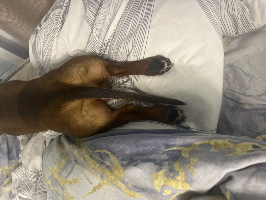 - "In Раздолье, Russia, a short-haired dog, predominantly reddish-brown and tan with a darker dorsal stripe, is observed lying prone on a bed, viewed from its posterior" by FM-8MPnE3, licensed under CC BY 4.0