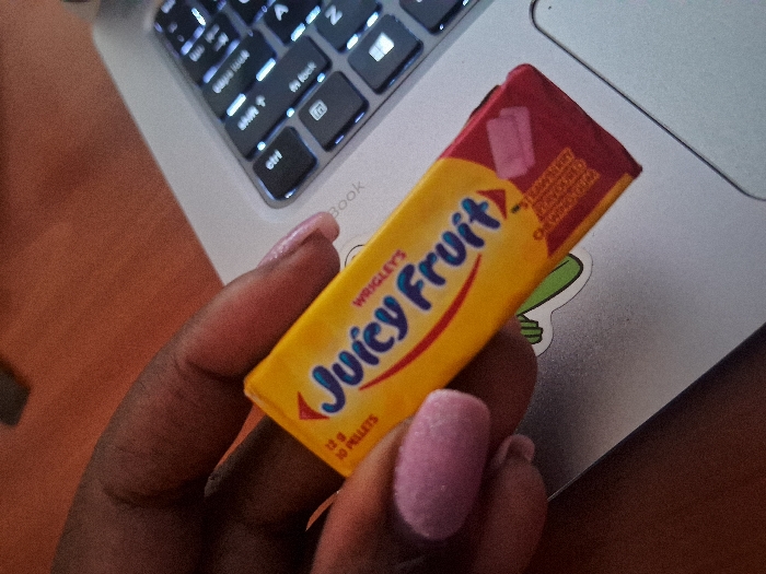 - "A dark-skinned human hand, with fingernails painted in light pink polish, holds a yellow, rectangular packet of Wrigley's Juicy Fruit chewing gum over a silver-grey laptop" by FM-UrRWw2, licensed under CC BY 4.0