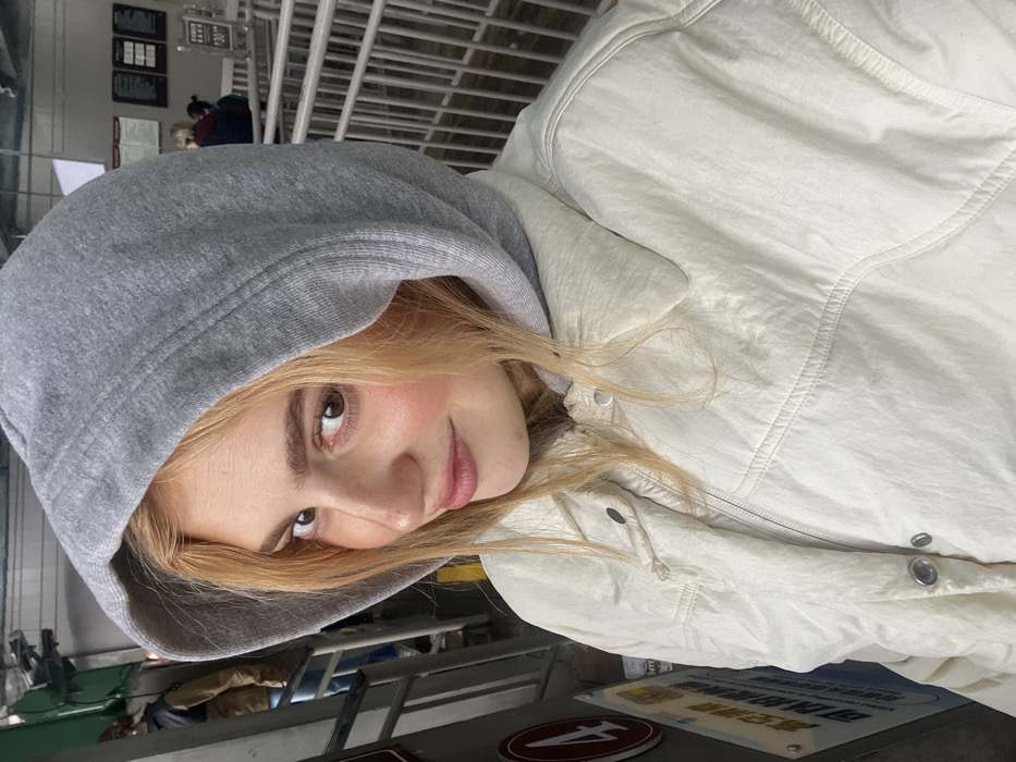 A young woman with blonde hair is shown in a selfie, wearing a gray hoodie and a light-colored jacket