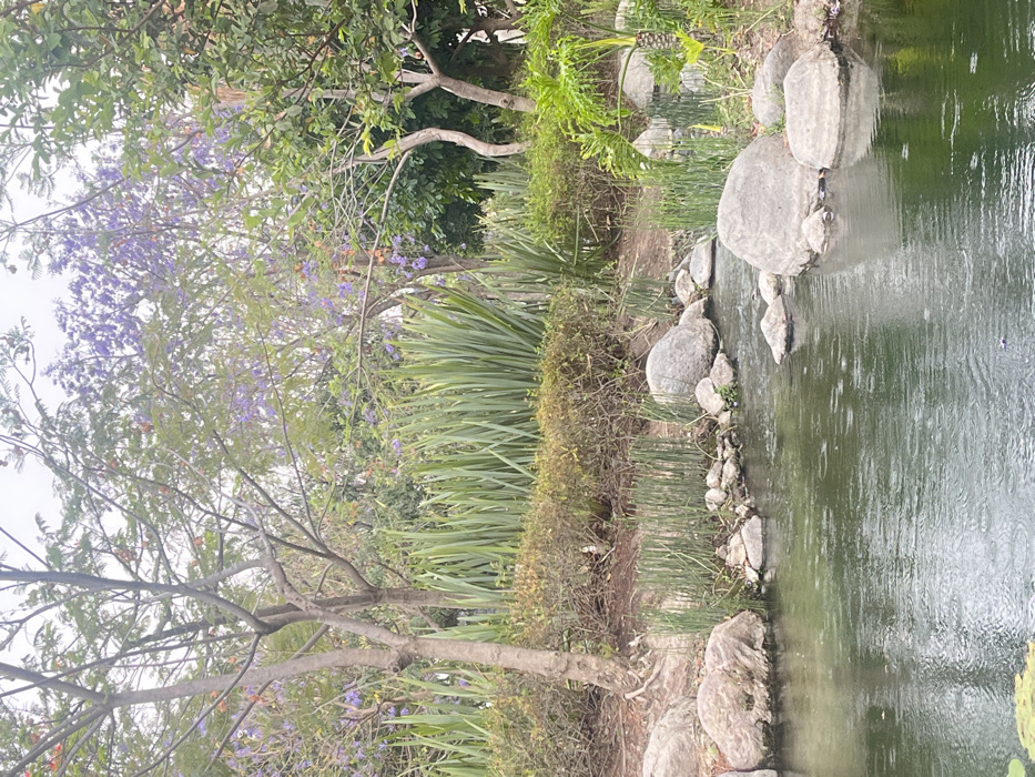 This image displays a natural outdoor scene in Santa Ana Yancuitlalpan (Chilhuacán), Mexico, under an overcast sky. The foreground is dominated by a placid body of water, likely a pond or stream, with its surface visibly disturbed by numerous raindrops, creating small, concentric ripples. Several smooth, grey, water-worn boulders of varying sizes are positioned along the water's edge and partially submerged. Clusters of thin, upright green aquatic plants emerge from the water and its immediate bank, particularly on the left side. One large, flat green lily pad is visible on the water in the bottom-left corner. The midground features the bank ascending from the water, covered with a layer of earth and some exposed tree roots. Above this, a dense line of low-lying shrubs with a mix of green and brownish foliage spans the width of the image. Behind these shrubs, a prominent section of tall, vertical, blade-like green plants creates a distinct visual barrier. The background is composed of a dense array of trees with visible, branching trunks and limbs. Many of these trees are in bloom, displaying numerous clusters of purple flowers, likely Jacaranda, along with patches of green leaves and some scattered orange-reddish blooms. The overhead sky is uniformly light and grey, indicating an overcast condition. No individuals, animals, or artificial structures are present within the frame.