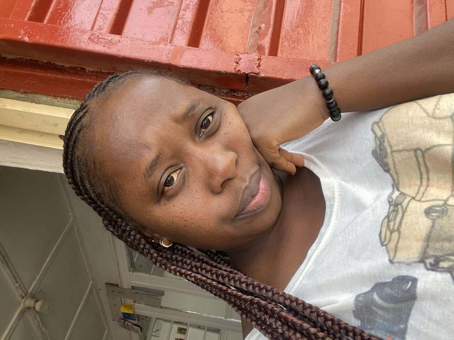 A medium close-up portrait features a young adult female with dark skin and long brown box braids, looking directly forward with a neutral expression