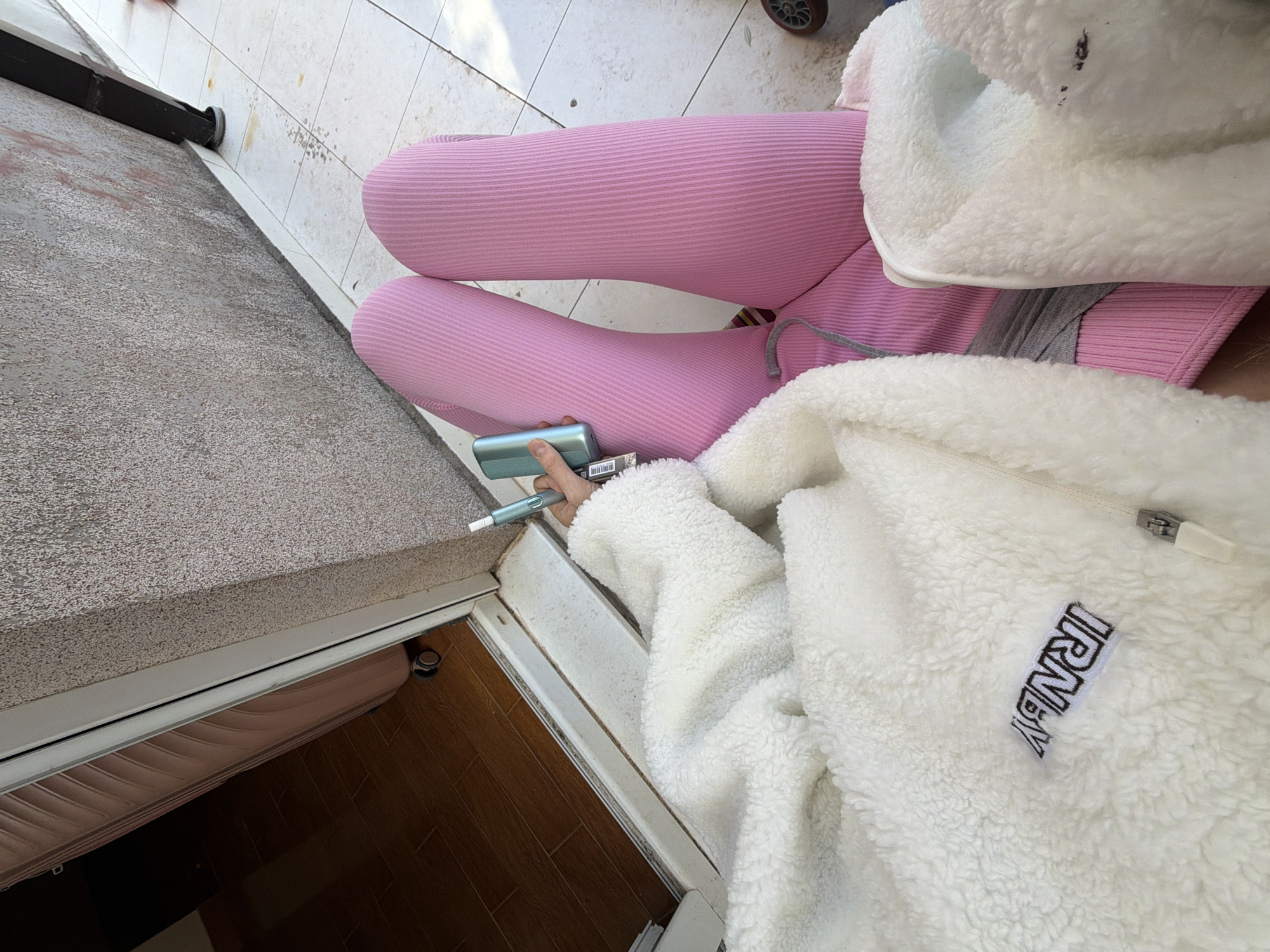 An overhead perspective captures a seated individual on what appears to be an outdoor balcony or terrace. The individual's legs are extended, clad in pink, ribbed leggings. A white, fluffy jacket or sweater, featuring a visible tag with the word "JRNBY", covers the upper body. The individual's right hand holds a light blue electronic device, consistent with a heated tobacco product, along with a small white and red package. The outdoor flooring consists of light-colored square tiles, exhibiting scattered stains and minor debris. A textured, greyish-brown wall, also showing areas of discoloration at its base, bounds the outdoor space. To the left, an open doorway with a white frame provides a view into an interior room with a brown wooden floor, where a pink hard-shell suitcase is partially visible. A black vertical pipe or support structure is present on the right, rising from a circular metal fixture embedded in the tiled floor. The specific location within Nerin, Montenegro, cannot be independently verified from the visual information presented.