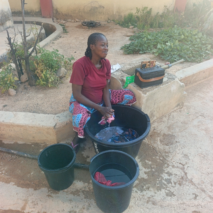 A woman washes clothes in a black tub outside. She sits on a low concrete wall, wearing a maroon shirt and colorful patterned skirt. Two more black tubs sit nearby, one empty and one filled with water and a red item. A black box rests on the concrete wall behind her, near a faucet. The area appears to be a yard or courtyard with a building in the background and some vegetation surrounding the washing area.