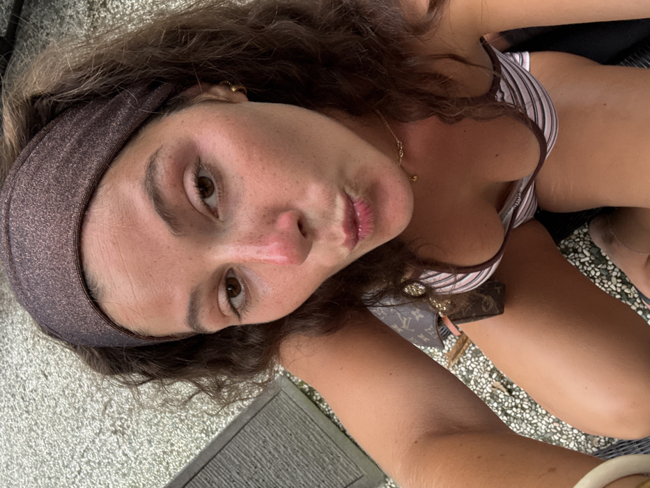 A high-angle, close-up photograph depicts a female subject outdoors in Uluwatu, Indonesia. The subject, positioned centrally, is a light-skinned individual with dark brown, wavy hair held back by a shimmering brown headband. Her face exhibits freckles, dark brown eyes, and a reddish nose. She is looking directly at the camera with her lips pursed in an expressive gesture. She wears a striped tank top with brown trim, a delicate gold chain necklace with a small pendant, and a gold stud earring in her right ear. A small, monogram-patterned handbag, consistent with a Louis Vuitton design, is visible on her left side, resting against her upper thigh. The background consists of a pebbled or textured concrete ground surface. A dark, rectangular, textured object is partially visible in the upper left background.