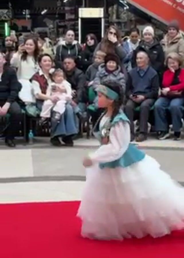 A young girl in traditional Kazakh clothing is shown walking and twirling down a red carpet laid in a mall