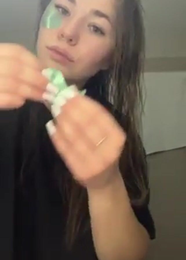 A woman with wet hair and painted white nails is shown from the chest up in an indoor setting. She is wearing a black t-shirt and putting green eye patches on her face, focusing on placing the second one under her eye. Music is playing.