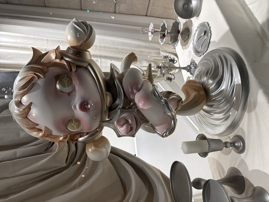 The image depicts a meticulously arranged display in what appears to be a retail window or exhibition space. Central to the scene is a large, stylized figurine resembling a child, approximately 1 meter in height, with pale skin, blush-toned cheeks and knees, and spiky light brown hair. Its head is disproportionately large, featuring wide, gold-colored eyes with white star-shaped pupils and a small mouth revealing two tiny fangs. The figure is clad in metallic silver-toned armor elements on its shoulders, elbows, and knees; its left hand, encased in a stylized gauntlet with a pointed protrusion, is clenched. The figure is dynamically posed, balanced on one leg, and rests on a large, silver, swirling circular base. To the left of the main figure, two silver-toned pedestals with flat, empty tops are positioned alongside a silver fluted candle holder containing an unlit white pillar candle. To the right, a silver candelabra with multiple unlit white candles stands behind the figure. Further right, a three-tiered silver dessert stand holds small red berry-like objects on each level. Adjacent to this, an oval silver tray displays a silver spoon and fork, and a separate silver dome-shaped cover is visible. All these decorative elements are placed on a white tablecloth. The background consists of draped beige fabric curtains on the left and a section of light-colored, faux-stone block wall on the right. This display is situated within a commercial establishment, such as a Pop Mart store, in Paris, France.