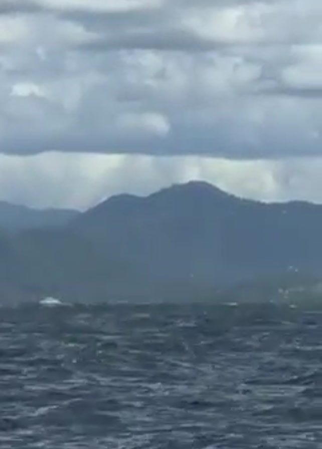 The video depicts a view from a boat on a choppy body of water, with mountains visible in the background