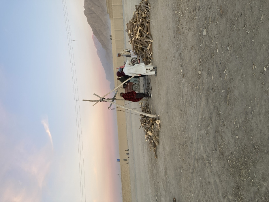 A scene depicting a group of people with a cart loaded with cut wood. A wooden structure with a windmill-like top stands nearby. The area is arid, with mountains visible in the background. The sky transitions from a blue to an orange hue, suggesting it's either sunrise or sunset. The ground is dusty and there are piles of wood scattered around. The setting appears to be a rural or underdeveloped area.