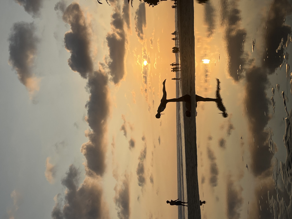The image depicts a beach scene in Kathaluwa, Sri Lanka, at sunset. The sky transitions from a light blue-grey at the top to a vibrant orange and yellow hue near the horizon, with the sun partially visible as a bright orange orb slightly right of center. Scattered dark grey and orange-tinged clouds are present across the sky, with their reflections visible in a large pool of standing water occupying the immediate foreground of the sandy beach. In the midground, two individuals are performing an acrobatic pose on the sand; one person lies supine, serving as a base, supporting another person in a horizontal, elevated position on their feet, both rendered in silhouette. Their complete reflections are sharply visible in the foreground water. To the left of these individuals, a solitary figure stands facing the ocean. Further to the right, a group of approximately 8-10 people are scattered along the shoreline, some appearing to carry surfboards, all silhouetted against the setting sun and ocean. The ocean surface is visible behind the beachgoers, with gentle waves breaking near the shore. On the far right, palm trees are partially visible in silhouette, marking the edge of the land.