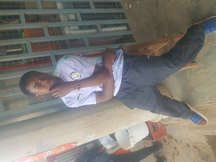 A young male individual, appearing to be a teenager, is seated in a semi-outdoor or open-fronted area. He has short dark hair and is wearing a light purple short-sleeved sports jersey with a crest emblem and a Puma logo, dark grey drawstring track pants, and blue and white slip-on sandals. A beaded bracelet is visible on his right wrist. He is positioned on a small light-colored wooden stool, leaning against a cream-colored concrete pillar on the left. His right hand is resting against his chin, and he is looking directly at the camera. In the background, behind the subject, a grey metal grate structure is visible, consistent with a security gate or window bars. To the immediate left of the main subject, a white plastic bucket sits atop an orange plastic beverage crate, partially branded "AMSTEL." The lower legs and feet of a second individual, wearing dark pants and dark footwear, are partially visible on the far left of the frame. The ground is a light-colored concrete surface. The specific location within Jos, Nigeria, cannot be determined from the visual evidence presented.