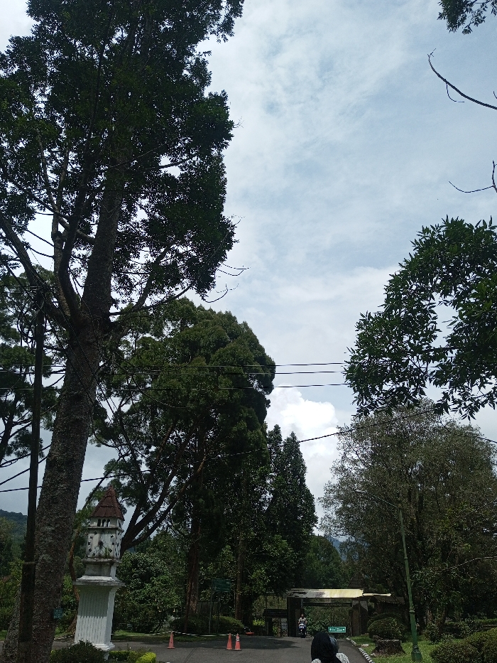 The image depicts an outdoor scene in Padegaon, India, characterized by lush greenery and a partly cloudy sky. In the foreground, a dark paved road extends towards the middle distance. On the left side of the road, a white ornate pillar with a weathered, reddish-brown spire-like top stands vertically. Two orange traffic cones are positioned on the road to its right. Tall, densely foliated trees dominate the left side and background, with their dark green canopies filling much of the upper and middle frame. Three parallel electrical wires traverse horizontally across the mid-section of the image. In the middle distance, a dark, stone-like archway or gateway spans the road, appearing to be an entrance to an area beyond. A person on a white scooter or motorcycle is visible beneath this archway, with another individual possibly standing nearby. The back of a person's head and shoulders, wearing dark clothing, is partially visible in the lower right foreground, facing towards the gateway. Beyond the archway, more dense forestation and possibly distant hills or mountains are discernible under the light blue sky with scattered white clouds. The overall environment suggests a natural or park-like setting with an established road and entry point.