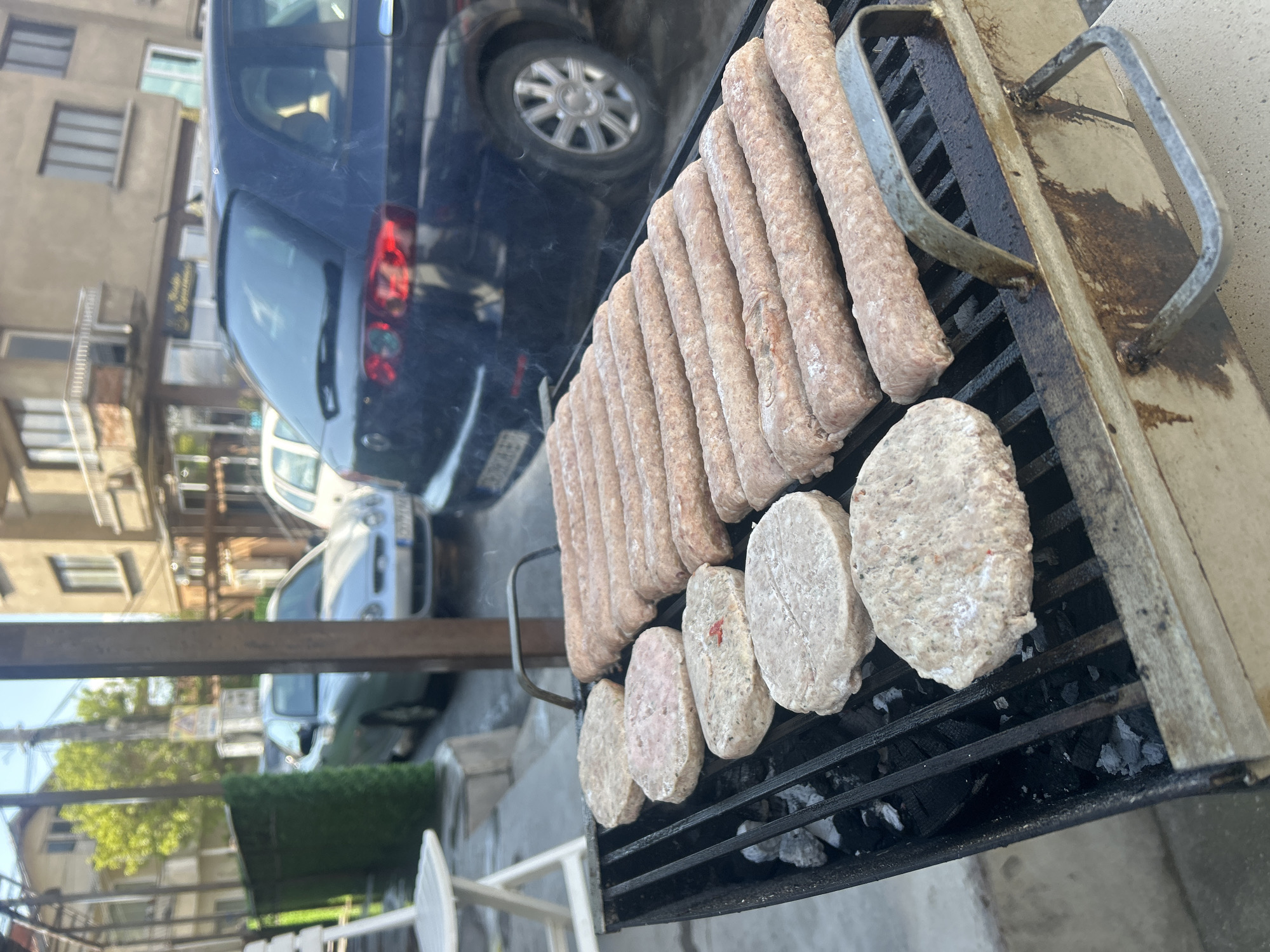 grill with ten cevapcici (skinless sausages) and four pljeskavica (meat patties) cooking over charcoal. The grill is outdoors, with a residential building and parked cars visible in the background. The location is Kyustendil, Bulgaria.