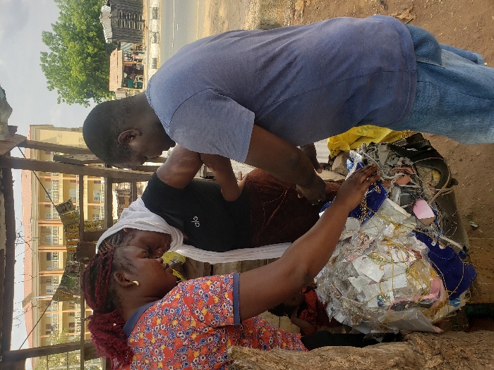 The image depicts three individuals—two females and one male—gathered around a large, bundled collection of miscellaneous materials under a rudimentary wooden shelter in Adankolo, Nigeria