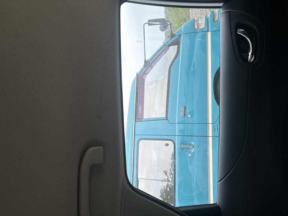 The image presents a view from inside a vehicle, looking outward through a side window. The upper portion of the frame shows the vehicle's gray interior ceiling and a white grab handle. The lower portion displays a dark door panel with a chrome door handle. Adjacent to the camera's vehicle, a teal-blue minivan is visible, partially obscured by the foreground car's interior. The minivan features a light-colored horizontal stripe running along its lower body. Visible components include a side sliding door with a black handle and a keyhole, a front passenger door with a black handle and keyhole, and two windows. The front passenger window is equipped with a purple-tinted rain visor. Water droplets are present on the minivan's exterior surfaces. Through the minivan's windows, an indistinct, light-colored object or figure is partially visible inside. The environment outside the vehicles appears overcast. Reflections in the minivan's rear window show green foliage. Beyond the minivan, a light-colored, possibly unpaved ground surface is visible, along with distant sparse vegetation and a tall, slender utility pole or tower structure against a pale sky. No identifiable individuals or specific actions are discernible. The scene is located in Chenggong, Taiwan.
