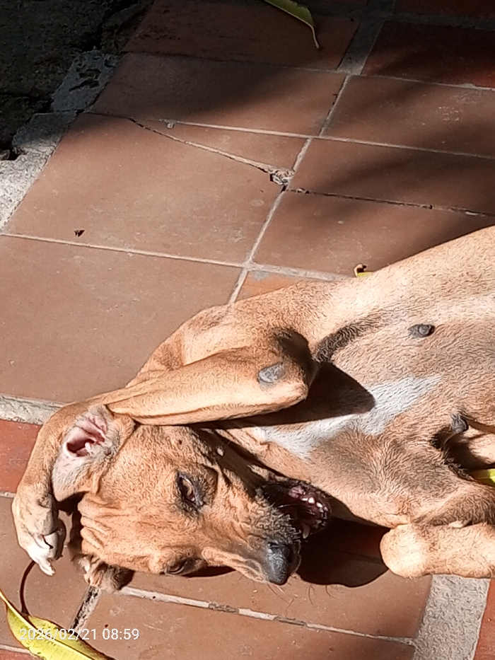 On February 21, 2023, at 08:59, an outdoor scene was documented in Altagracia, Venezuela, likely within a residential patio or backyard. The primary subject is an adult, medium-sized, short-haired domestic dog, appearing to be female, characterized by a tan/brown coat with lighter fur on its ventral side. The dog is positioned dorsally (on its back) on a reddish-brown tiled surface. Its right forelimb is bent, with the paw resting over the right side of its face and eyes. The mouth is slightly open, revealing teeth. The dog's right ear shows signs of redness and possible inflammation or injury. The abdominal and flank regions display several small, dark, raised lesions. A distinct, circular, lighter-colored scar or lesion is visible on the lateral aspect of the left foreleg, near the elbow. The tiled surface features square pavers with visible grout lines; some tiles exhibit cracks. Strong sunlight illuminates portions of the scene, creating distinct shadows across the dog and the ground. Scattered dry leaves are present on the tiles, and a small dark insect is visible on a tile near the dog's head. The immediate background to the left indicates an unpaved or rough concrete edge. No human subjects are present in the image.