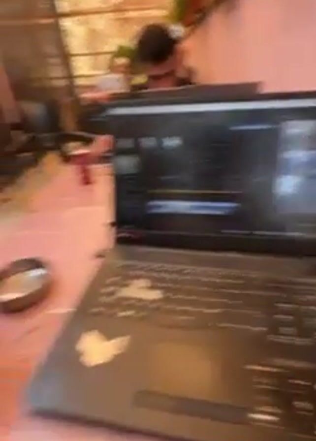 n indoor/outdoor café setting where at least two people are working on laptops. In the foreground, a black laptop displays a video editing software interface with a video clip playing. Next to the laptop, there’s a blue can of Pepsi. Another person's hand reaches into the frame and opens a red can of iced coffee. On the table next to the iced coffee, there is an ashtray containing cigarette butts. The table has a pinkish-purple wood grain pattern. In the background, other patrons can be seen working on their laptops at separate tables. The overall lighting indicates it is daytime.