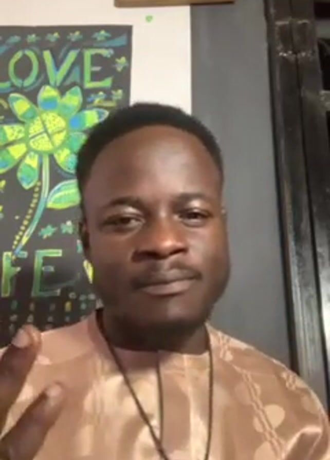 A man is speaking directly to the camera. He has short dark hair and a mustache. He is wearing a light beige patterned shirt with a dark cord necklace. He performs hand gestures, including a peace sign and bringing his hands together as if in prayer. He is wearing rings on both hands. Behind him is a piece of artwork with the word "LOVE" and a large flower design. Above it is a small framed picture of cacti. To his right is a metal window frame. In the background, there is loud music playing.