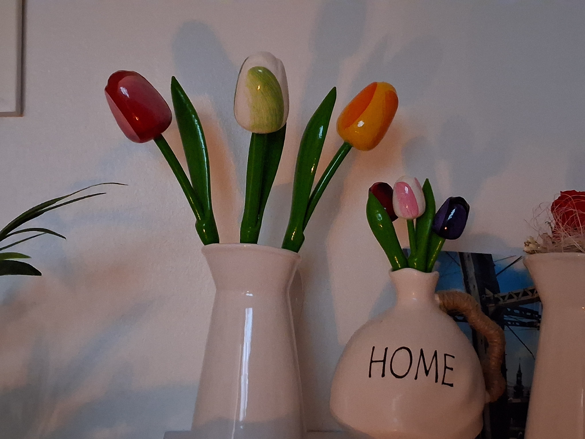 The image displays an indoor arrangement of three ceramic vases containing artificial tulip decorations, positioned against a light-colored wall with visible shadow casting. On the left, a tall, white ceramic vase holds three artificial tulips with green stems and leaves. These tulips have glossy, rounded petals: one red, one white with a green vertical stripe, and one orange with a yellow vertical stripe. To the right, a shorter, white ceramic pitcher-shaped vase, featuring a brown rope handle on its right side, is inscribed with the word "HOME" in black capital letters. This vase contains three smaller artificial tulips with green stems and leaves. Their glossy petals are dark red/maroon, pink, and dark blue/purple, respectively. Partially visible on the far right is a third, mostly obscured white container with red, fibrous decorative material emerging from its top. Behind the 'HOME' vase, a photographic print or postcard depicts a segment of a large metal truss bridge against a blue sky, with the dark silhouette of a building featuring a prominent spire visible beneath it. This structure is identifiable as the Dormition of the Theotokos Cathedral in Varna, viewed in conjunction with the Asparuhov Bridge. The scene is illuminated from the left, casting soft shadows of the vases and flowers onto the wall. Based on the identifiable landmarks in the background image, the location is an interior space within Varna, Bulgaria.
