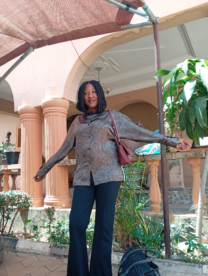 An adult female is positioned centrally outdoors in Narayi, Nigeria. She wears a long-sleeved, patterned brown and grey shirt, black flared trousers, and a maroon shoulder bag slung over her left shoulder. Her dark hair is styled in short braids forming a bob. She faces the camera with a smile and outstretched arms. Above, a reddish-brown mesh canopy is supported by metal poles. The background features a building facade with light peach-colored arched structures, two prominent columns, and ornate ceiling details. Green foliage from various plants, including potted specimens, is visible around the scene. The ground in the foreground is paved with light-colored tiles, bordering a concrete curb with black and white stripes. A black backpack rests on the tiled ground to the lower right.
