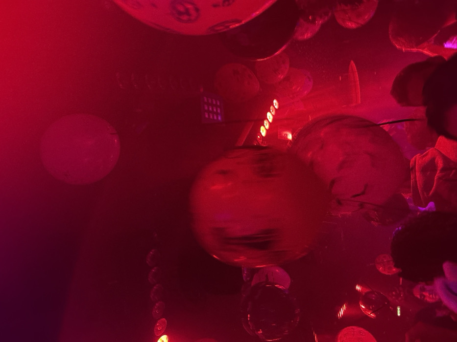 The image displays an indoor scene characterized by intense red illumination and a hazy atmosphere, indicative of a nightclub or event venue. Dominating the foreground and midground are several large, inflatable balloons. A prominent, red-tinted spherical balloon with dark, indistinct patterns occupies the center-left. To its immediate lower right, another large, irregularly shaped balloon is visible. In the upper right quadrant, a section of a lighter-colored balloon exhibits distinct dark circular patterns, possibly logos or emojis. Numerous smaller, reflective spherical objects, resembling miniature disco balls or mirrored balloons, are scattered throughout the background, reflecting the red light. Overhead, a horizontal strip of small, bright red lights is visible, alongside a rectangular panel emitting purple LED lights on the right side. The lower portion of the frame contains the heads and shoulders of multiple individuals, largely obscured and indistinct due to the low, red lighting, suggesting a crowded gathering. The specific location within the city of Paris, France, is not ascertainable from the visual information presented.