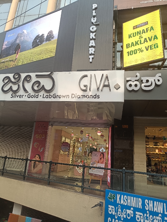 storefront of a jewelry store called "GIVA" in Bengaluru, India. The store's address is 12.973, 77.607. The storefront is on a street level with a large sign reading "GIVA" and "Silver Gold Lab Grown Diamonds" in English and Kannada. There is a smaller sign displaying "GIVA" and "50% Off". The storefront has a glass door and a window with various jewelry displays. A woman with long hair and a white shirt is visible through the window, possibly a staff member. The image shows a second storefront behind GIVA, with a yellow sign promoting "Kunafa & Baklava" and a smaller, blue sign in Kannada, possibly for a Kashmiri shawl shop. The image also shows an LED screen with an advertisement showcasing a mountain landscape. The scene is bright with natural lighting and the sidewalk is clean.