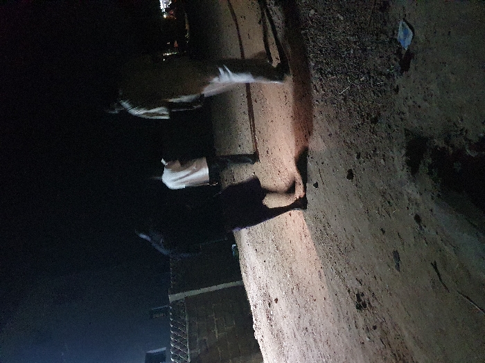A night shot shows a person in dark clothes and white shirt walking on a sidewalk next to a dark road. The person is positioned in the upper left of the image, partially obscured by the darkness. The sidewalk, grainy and uneven, takes up much of the right side of the frame, with dirt and debris scattered on its surface. In the distant background, lights appear out of focus.